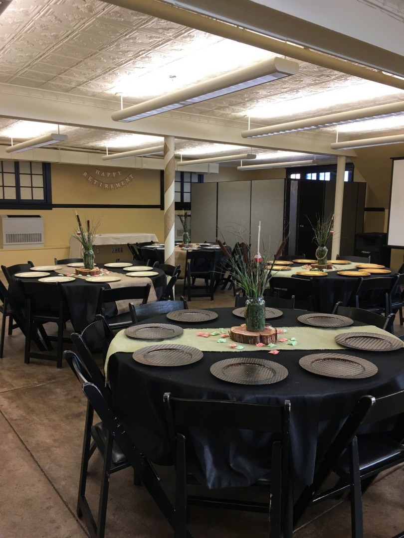 Lower Level: Our lower level is great for baby showers, birthday parties, and more! It features a ceiling of antique pressed tin tiles and concrete floor. It is a blank canvas ready for you to bring your vision for a smaller party to life!