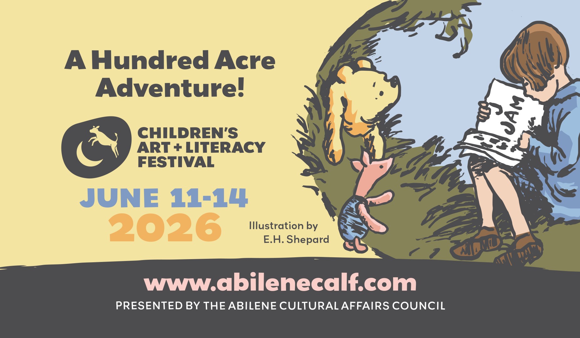 Enjoy four family-friendly days of fun at the 14th Children's Art + Literacy Festival in downtown Abilene at 17 venues presented by the Abilene Cultural Affairs Council. Celebrate "The Art of Winnie-the-Pooh" first illustrated by Ernest H. Shepard and written into life by A.A. Milne. The National Center for Children's Illustrated Literature will host a special exhibition exploring the world of Winnie and his friends from the Hundred Acre Woods. We will open the new Clear Fork Bank Storybook Garden with eight bronze sculptures Thursday night. Thursday events are free. Friday and Saturday events require a pass for everyone 3 and older. Wear your CALF pass Sunday and enter the Abilene Zoo for free for additional festival programming and animal encounters!