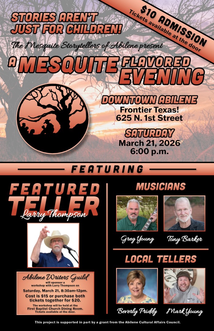 A fun evening of storytelling and music. Local storytellers along with the awarding-winning teller, liar, cowboy poet, Larry Thompson, share interesting, fun stories. Could be personal stories, historical stories, tall-tales, a poem. Musicians Greg Young and Tony Barker share their music and the stories behind the words. If you haven't been to a storytelling event, you are missing out. Give it a try!