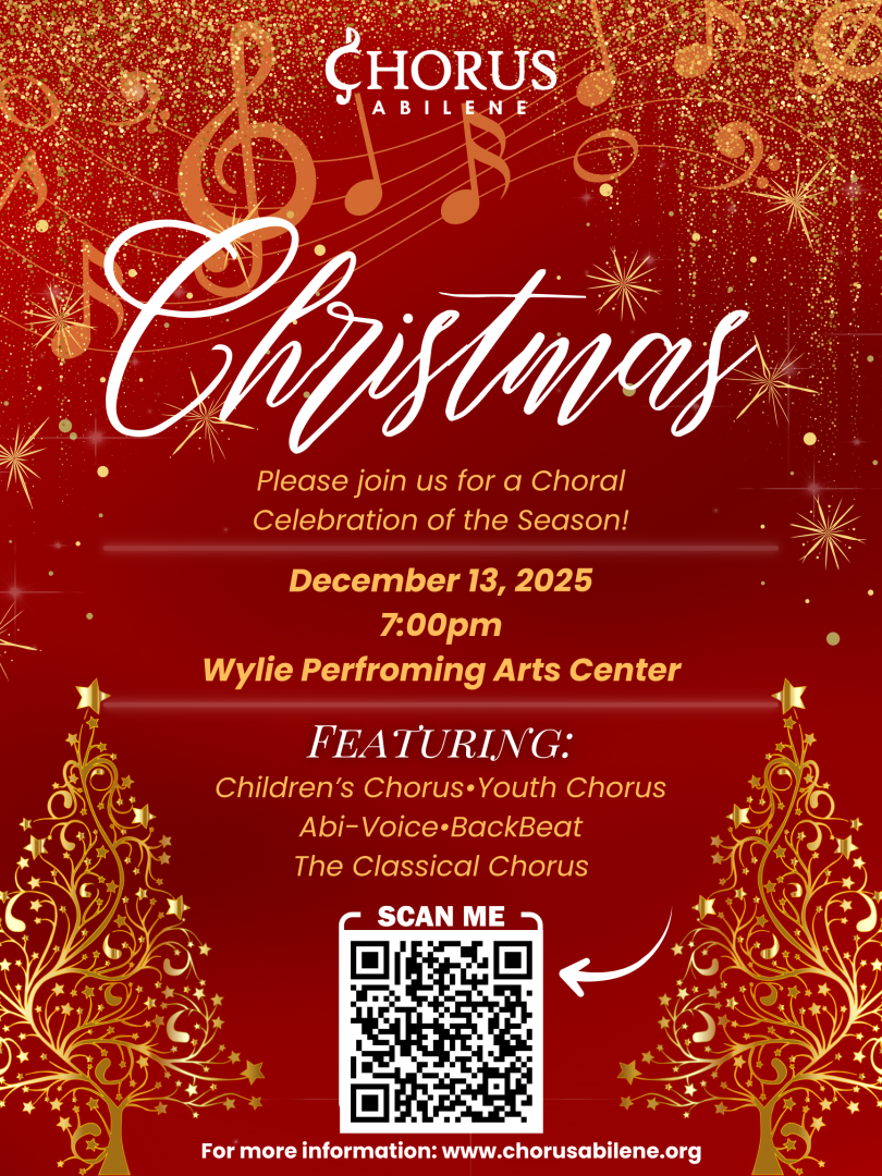 Chorus Abilene invites you to celebrate the joy of the season with our annual Christmas Concert on December 13 at 7 PM at the Wylie Performing Arts Center. This festive evening will feature beautiful holiday classics, uplifting choral works, and performances from our talented singers across the community. Please join us as we listen to all five of our choirs sing and celebrate the season!