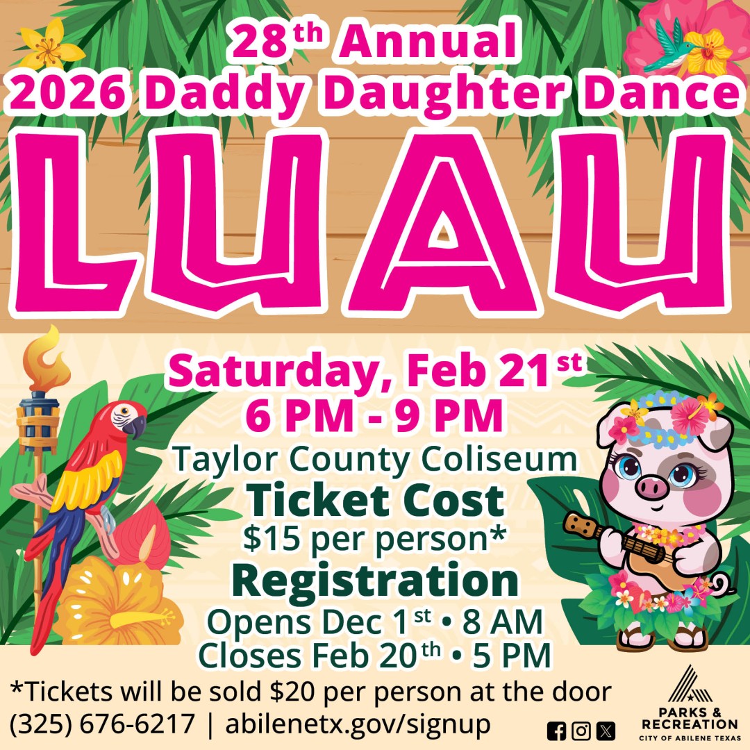 Aloha! Take a trip to a tropical island without ever leaving Abilene! Join us for the 28th Annual Daddy Daughter Dance at the Taylor County Coliseum. This year's theme is Luau. Enjoy an evening of fun, dancing, & special memories with your girl(s). The dance is open to girls ages 3+ & their dads or male role models. Please note, each person must be registered to enter the dance. Any cancelations must be made 14 days prior to the event start date.