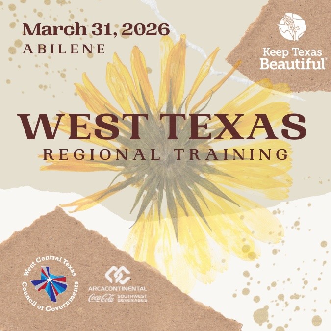 Join Keep Texas Beautiful (KTB) for the West Central Texas Regional Training, hosted by the West Central Texas Council of Governments. This in-person gathering brings together KTB affiliates, Keep Texas Recycling partners, and community organizations for a day of learning, discussion, and collaboration.